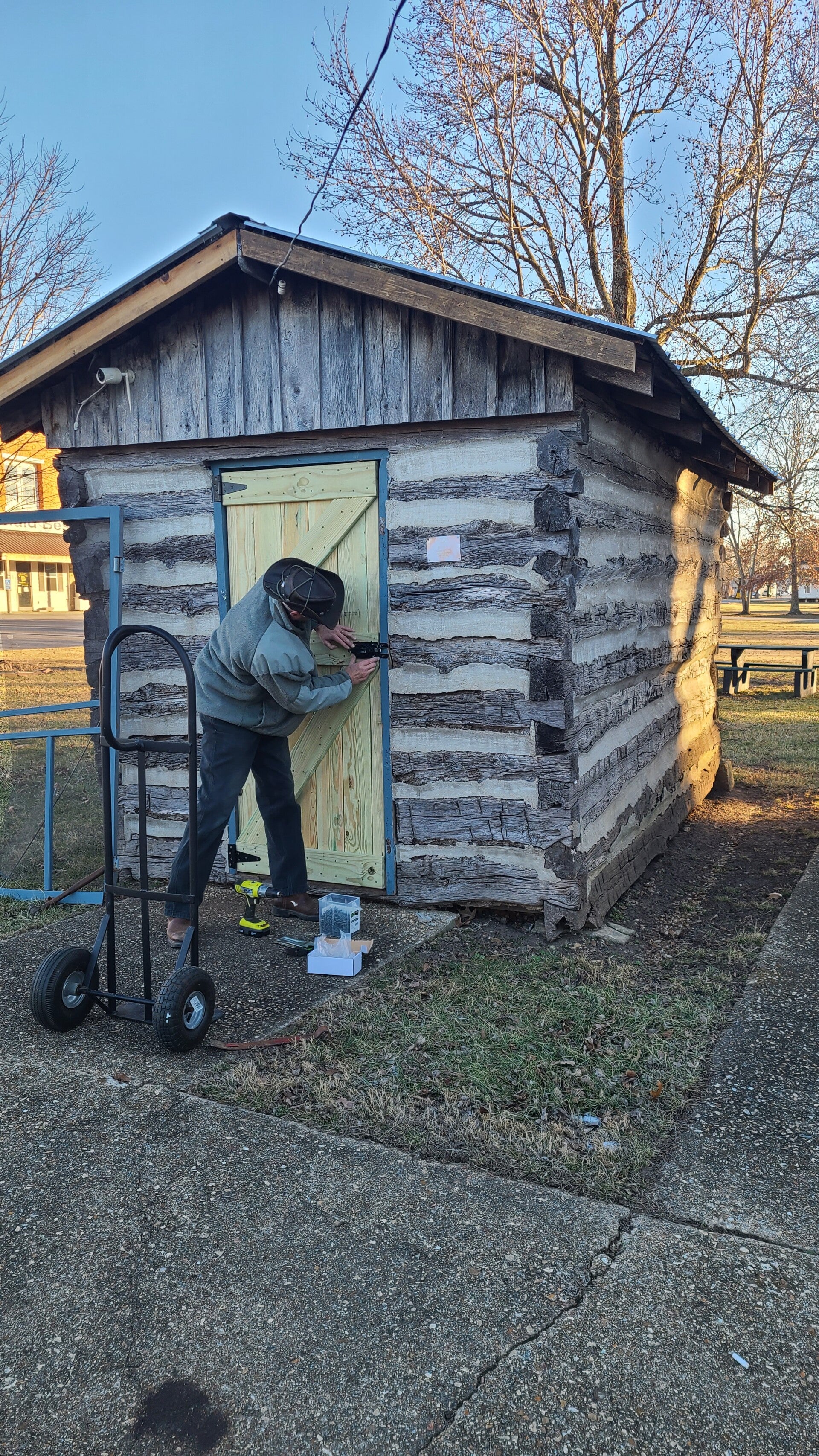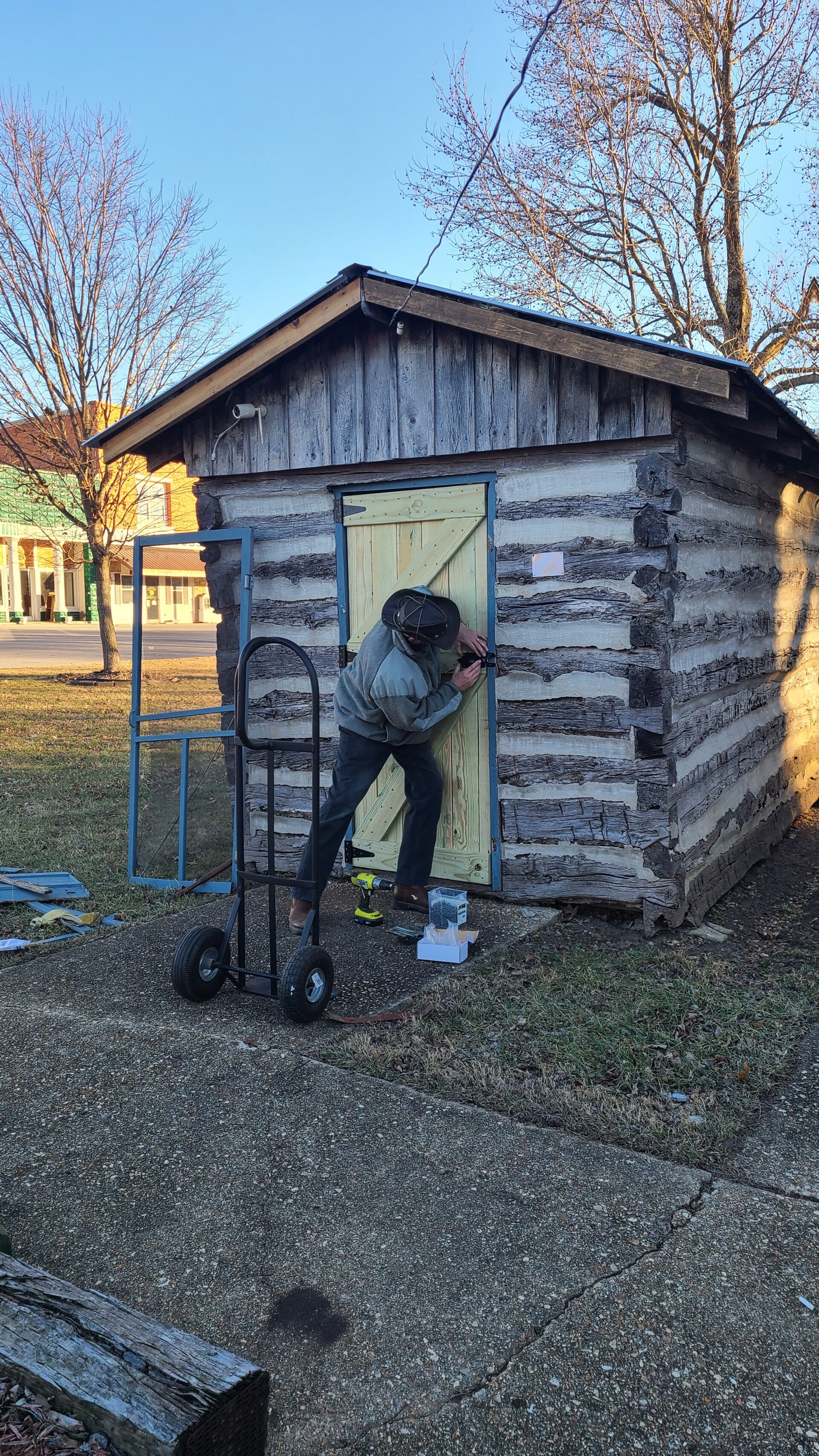 Have one new door done, with a second ready to go! Also, getting ready to put the signs up on the buildings for our Platinum Sponsorships! Getting some of the cabins ready to open for upcoming events. Thank you to Melissa and Terry Warren for cleaning out the Ice Cream Shack/1860 Corn Crib and starting on the clean-up in the Two-Story Cabin/Carbin Cabin.