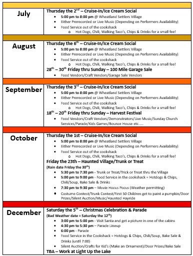 Welcome to our Event Calendar page at Wheatland Missouri Settler's Village.com. Here you can find information about the various community events and festivals that we organize throughout the year, aimed at driving economic development, cultural awareness, and historical education in the area.