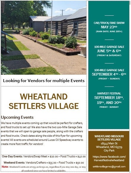 These are all the listed events where we need vendors! You can contact us through our email at settlersvillagemo@gmail.com, or our Facebook page at (13) Facebook